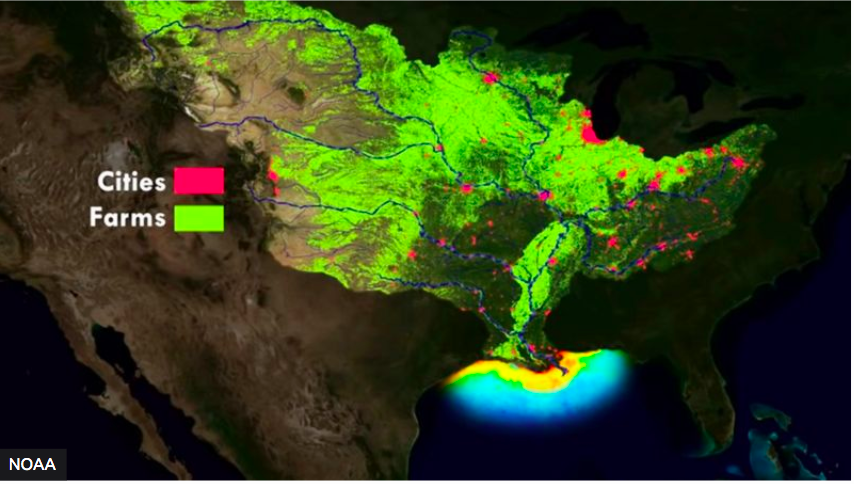 La zona amarilla con azul es la Zona muerta en el Golfo de México en donde descarga el Río Misissipi al mar llevando de miles de toneladas de contaminantes de la agricultura industrializada.
